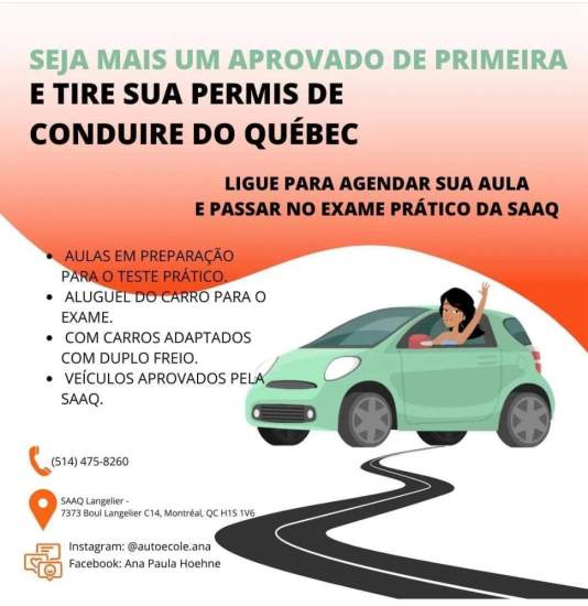 Sou a Ana instrutora de direção em Montréal. No Brasil tenho um Bac em Comex mas aqui no Canada decidi trabalhar com aulas para auxiliar as pessoas no exame prático da SAAQ e também para aquelas que necessitam de práticas de direção. Tenho a certificação junto à AQTR (Associação Quebecoise de Transporte) juntamente com a SAAQ. Desde 2015 venho trabalhando com muita dedicação e comprometimento para melhor atender meus clientes e amigos. Venham ja e agende uma aula! Os carros são adaptados e certificados pela SAAQ. As aulas são em português e/ou francês.
