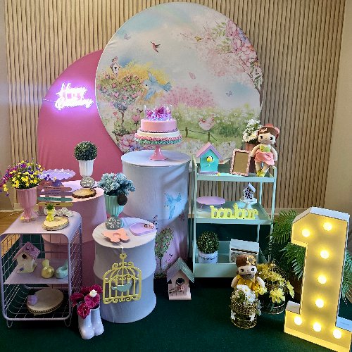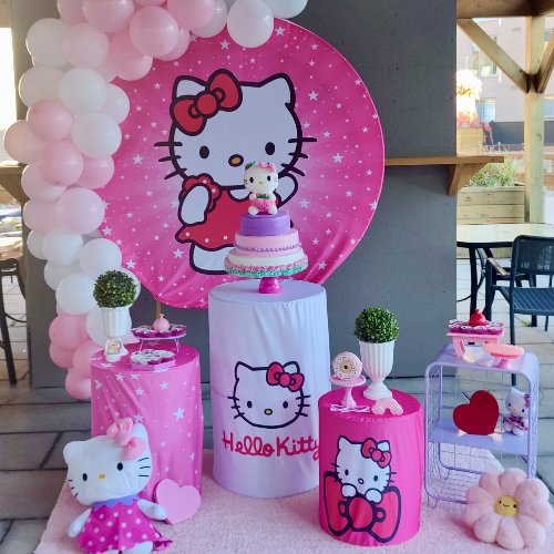 Aluguel de kit no estilo pegue e monte. Inclui suporte redondo com capa, cilindros com capas, mesas, suporte de bolo, suportes de docinhos, vasos com plantas/flores, tapete, quadrinhos e decoração temática. Obs: Temos serviço de montagem/ desmontagem, arco de balão e bolofake.